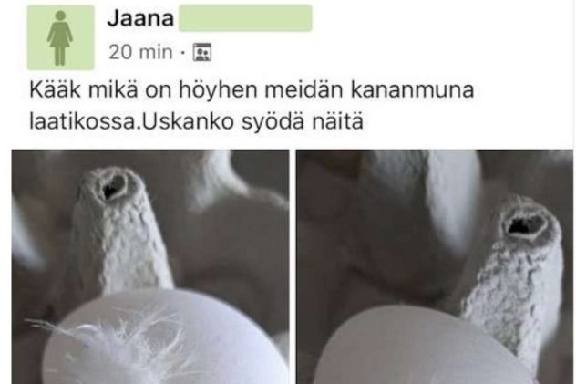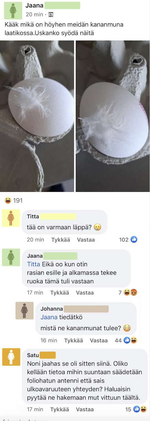 Jaana oli huolissaan, kun hänen ostamansa kananmunapaketin mukana tuli valkoinen höyhen. Muut joutuivat hieraisemaan silmiään, kun hän tämän jälkeen kysyi voiko munia syödä tämän seurauksena.