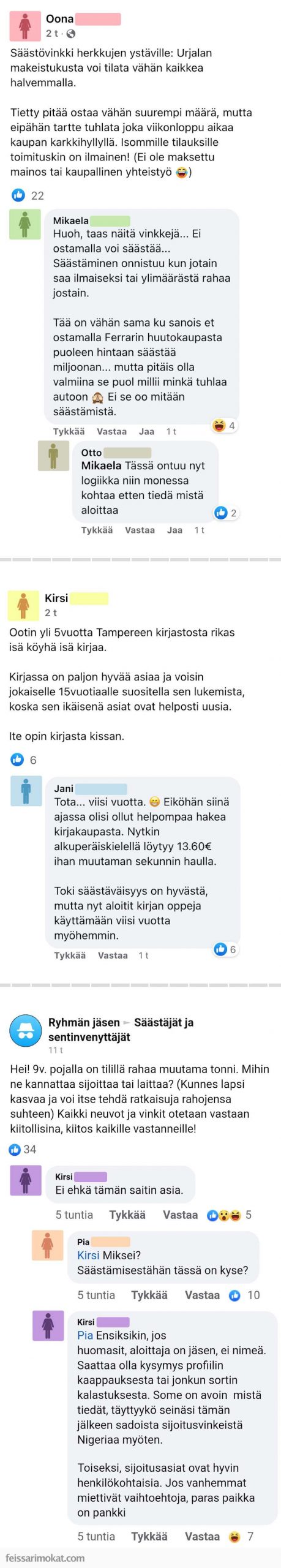 Alla oleviin julkaisuihin on koottu parhaita paloja sentin venyttämisestä sekä säästämisestä. Oheisia keskusteluja lukiessa huomaa, että säästäminen on monelle tulenarka aihe ja väittelyitä syntyy kuin sieniä sateella.