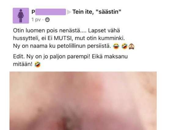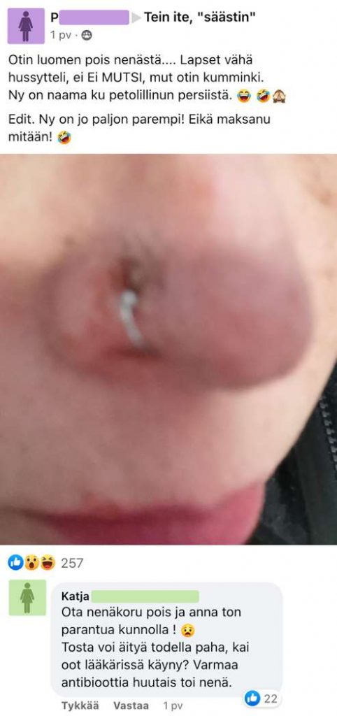 Eräs suomalaisnainen jakoi kuvan nenästään ja kertoi leikanneensa luomen itse pois. Kuva on hieman suttuinen, mutta omasta mielestäni nenä ei todellakaan näytä terveeltä. Tällaiset temput voivat aiheuttaa pahimmillaan verenmyrkytyksen tai kuolion nenässä.