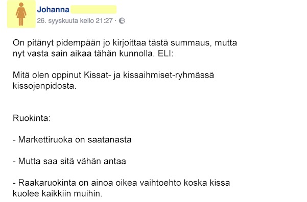 Kissaryhmän kirjoittamattomat säännöt on vihdoin selvitetty. Naisen vuodatus levisi muutama kuukausi sitten Facebookissa erittäin hyvästä syystä. Kissaryhmissä kannattaa todella olla varovainen siitä, mitä sanoo — muuten saattaa saada melkoisen vihavyöryn niskaansa. Voit lukea alta hulvattoman tilapäivityksen: