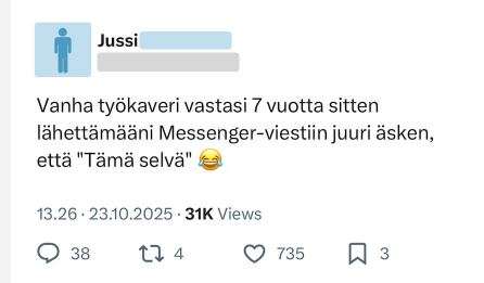 Seitsemän vuotta sitten lähetetty viesti sai tänään ytimekkään vastauksen: “Tämä selvä.” Jussi ehkä miettii, pitäisikö vastata nyt heti vai jatkaa perinnettä ja odottaa vuoteen 2032.