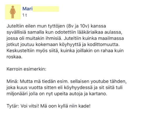 Mira kysyi Facebookissa antaako sosiaalitoimisto rahaa lastenvaunuja varten. Hänen mukaansa Jollyroom -merkkiset vaunut olivat liian kalliit työttömälle. Parin viikon kuluttua hän oli kuitenkin kiinnostunut täyttämään huuliaan – asioita täytyy priorisoida, sillä huulten täyttäminen ei myöskään ole edullista.