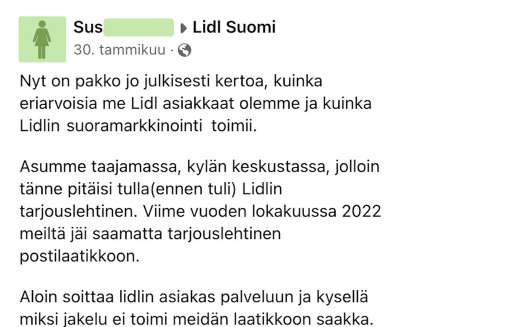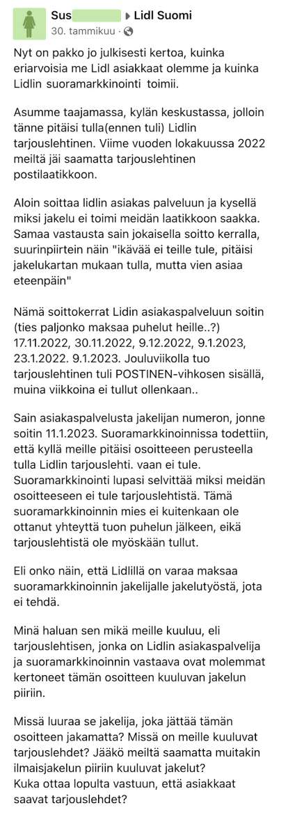 Eräs suomalaisnainen vaikuttaisi kuitenkin pitävän tarjouslehtisistä, sillä hän oli ollut yhteydessä LIDL:in asiakaspalveluun ja tämän jälkeen jakelijaan, kun tarjouslehtisiä ei näkynyt.