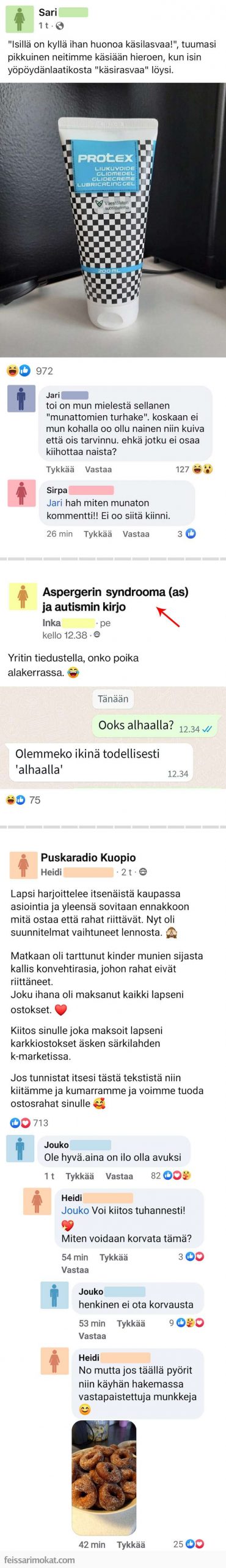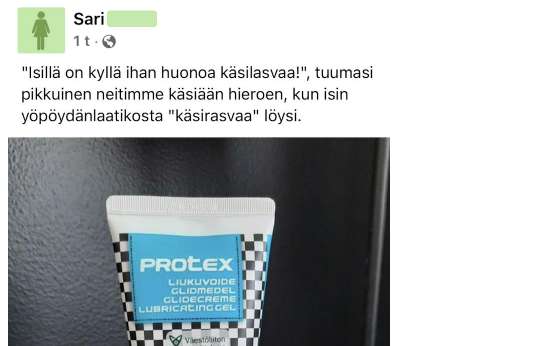 Oli miten oli – Sarin lapsi oli löytänyt yöpöydän laatikosta käsirasvan, joka ei ollut kuulema hyvä voide. Humoristinen julkaisu kääntyi nopeasti päälaelleen, kun Jari saapui paikalle ja latasi kommentin munattomista miehistä. Jari ei ilmeisesti ole kuullut aikaisemmin anaaliseksistä, jossa liukuvoidetta tarvitaan, sillä peräaukko ei eritä luonnollista liukastetta.