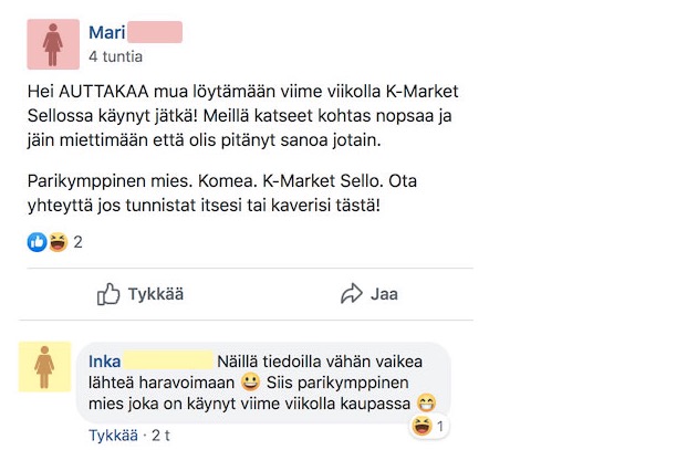Mari oli Sellon K-marketissa ostoksilla, kun hänen katseensa kohtasi parikymppisen jätkän kanssa. Mari ei kuitenkaan uskaltanut sanoa mitään, joten hän päätti etsiä miehen käsiinsä myöhemmin. Tuntomerkit olivat kuitenkin niin geneerisiä, ettei muiden avusta tule luultavasti olemaan mitään hyötyä.