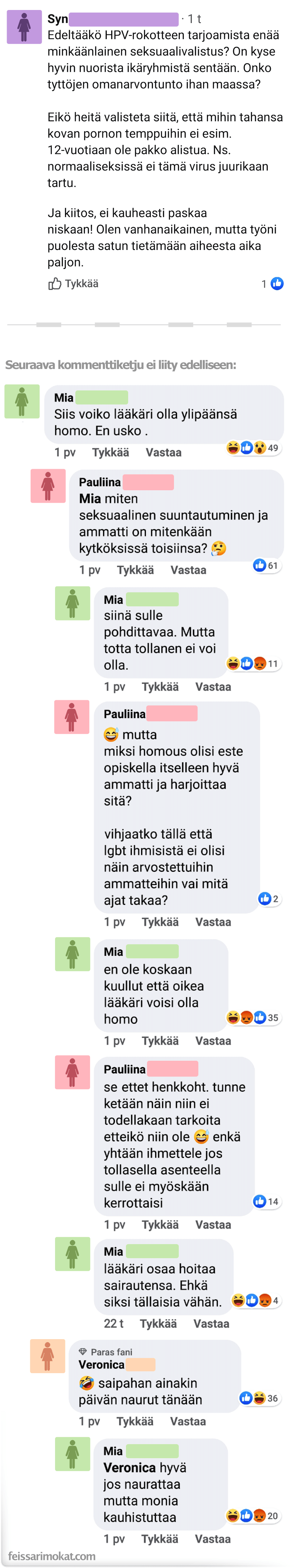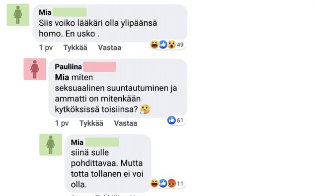 Mia ei voinut uskoa, että lääkäri voisi olla homo. Muut yrittivät kysyä, että millä ihmeen tavalla ihmisen seksuaalinen suuntautuminen liittyy hänen ammattiinsa. On käsittämätöntä ajatella, että homo ei voisi hoitaa vaikkapa lääkärin työtä yhtä hyvin tai paremmin kuin hetero. Elämme vuotta 2020, mutta osa ihmisistä tuntuu jääneen keskiajalle.
