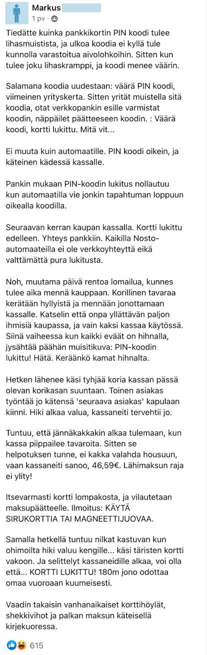Feissarimokat: miehen lihasmuisti petti ja PIN-koodi unohtui – tätä ei toivoisi kellekään