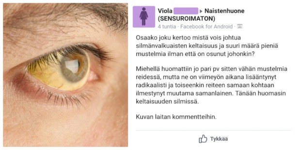 Sanoisin että siinä vaiheessa, kun kehoon alkaa ilmestyä erikoisia mustelmia ja silmät muuttuvat kellertäviksi – lääkäriin ja VÄLITTÖMÄSTI. Viola kysyi apua Facebookissa ja hän sai nopeasti vastauksia muilta ihmisiltä. Tosin luulisi että maalaisjärki olisi sanonut että nyt täytyy lähteä päivystykseen ja nopeasti.
