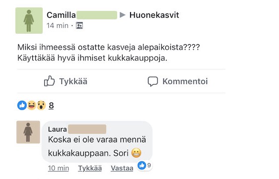 Camilla moitti Facebookissa ihmisiä, jotka ostavat kukkia ruokakaupoista, sen sijaan että he suosisivat pienempiä liikkeitä. On kuitenkin fakta, että pienemmät kukkakaupat ovat moninkertaisesti kalliimpia kuin ruokakaupat, joten kaikilla ei välttämättä ole varaa ostaa hienoja kukkia pienestä liikkeestä. Camilla ei tuntunut ymmärtävän tätä ja hän jatkoi saarnaamista.