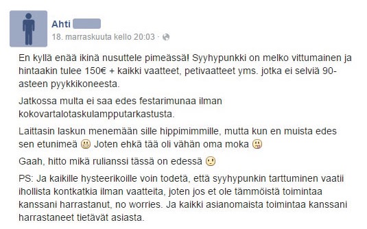 Ahti oli päätynyt petipuuhiin ja seuraukset olivat vähintäänkin kiusalliset. Suomalaismies oli saanut ”hippinaiselta” syyhypunkin ja joutunut tämän seurauksena pesemään kaikki petivaatteensa ja asusteensa. Harkitsisin silti kaksi kertaa ennen kuin julkaisisin näin kiusallisen tiedon Facebookissa!