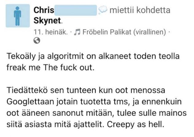 Isojen somealustojen algoritmit osaavat tänä päivänä kohdentaa mainontaa jopa pelottavan tarkasti. Vaikka yritykset väittävät etteivät ne salakuuntele kuluttajia, niin välillä mainokset osuvat niin oikeaan ettei epäilyksiltä ole mahdollista välttyä.