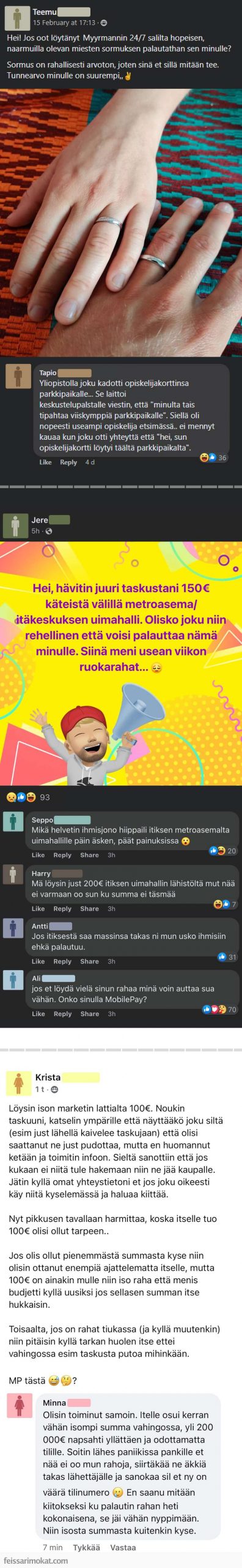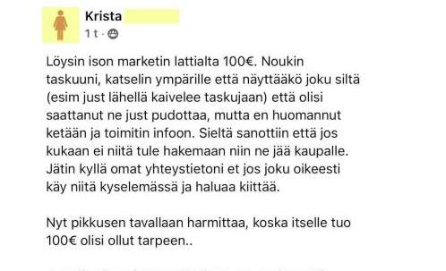 Voit lukea alapuolelta miten ihmiset toimivat tilanteissa, joissa he hukkasivat tai löysivät omaisuutta. Paras tarina oli viimeinen, jossaa Minna kertoi saaneensa tililleen sattumalta 200 tuhatta euroa. Veikkaan, että hän joutui pariin kertaan hieraisemaan silmiään.