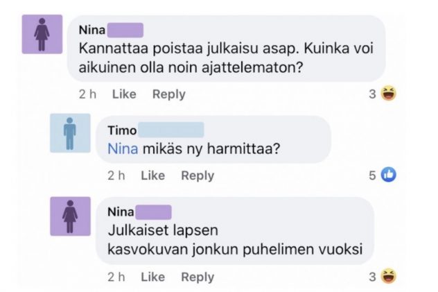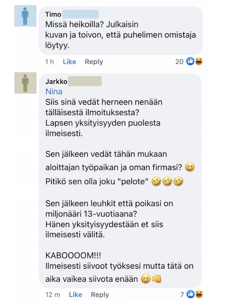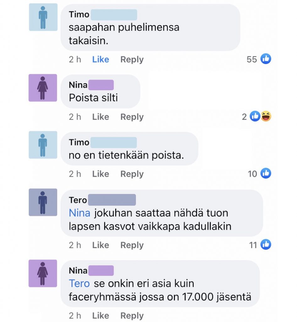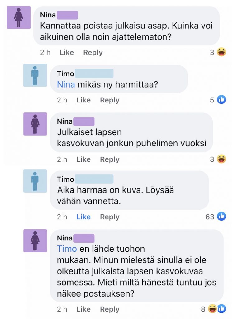 Timon ystävällinen teko johti kuitenkin välittömästi sanaharkkaan, kun Nina huomasi julkaisun. Suomalaisnaisen mukaan Timon kannatti poistaa julkaisu välittömästi, koska siinä näkyy lapsen kasvot. Nina totesi ettei lapsen kuvaa voi esitellä ryhmässä johon kuuluu 17 000 ihmistä – tässä ei kuitenkaan esitelty lasta vaan puhelinta, jonka alkuperäinen omistaja varmasti kaipasi sitä. Samalla muut huomauttivat, että myös Ninalla on kuvia lapsistaan, joiden ottamiseen ei luultavasti ole kysytty lupaa.
