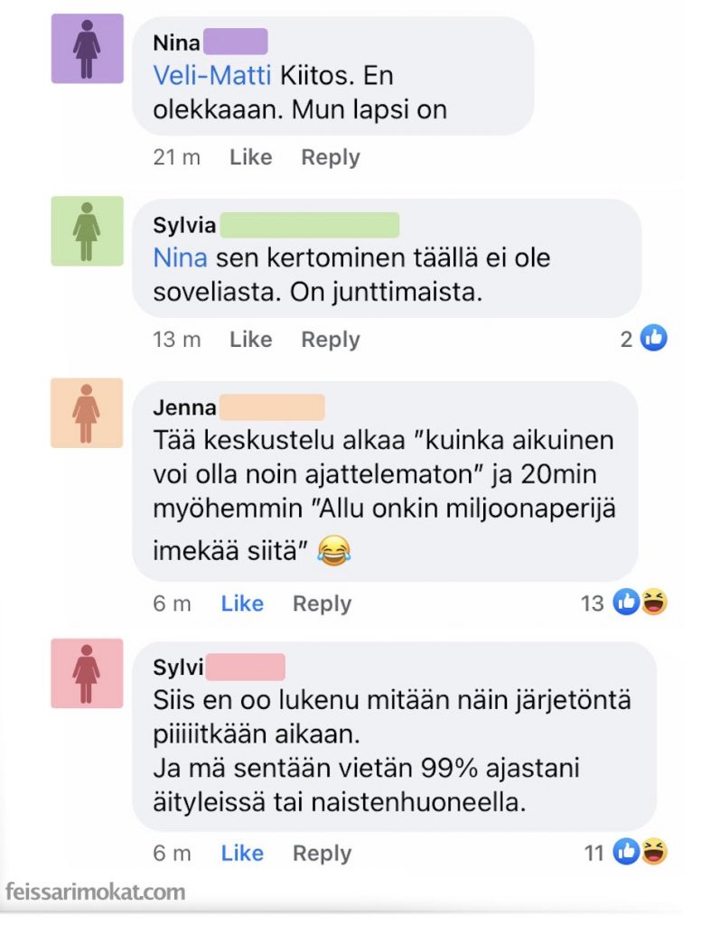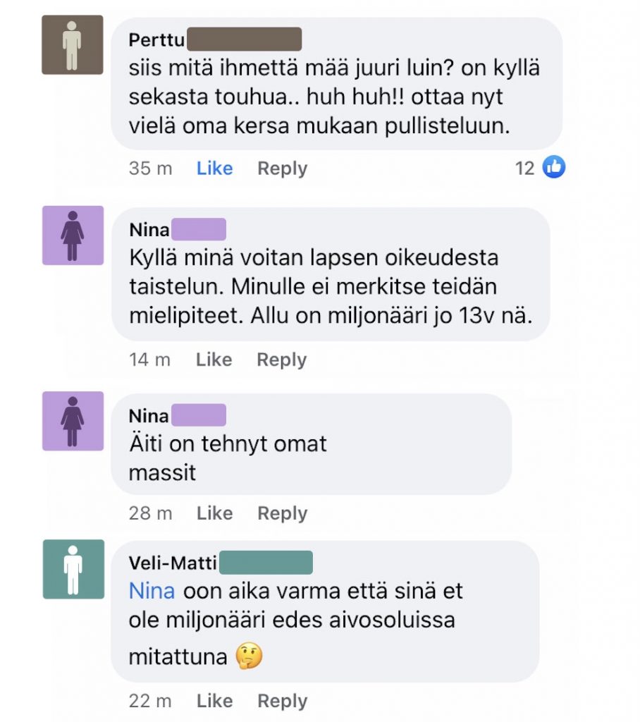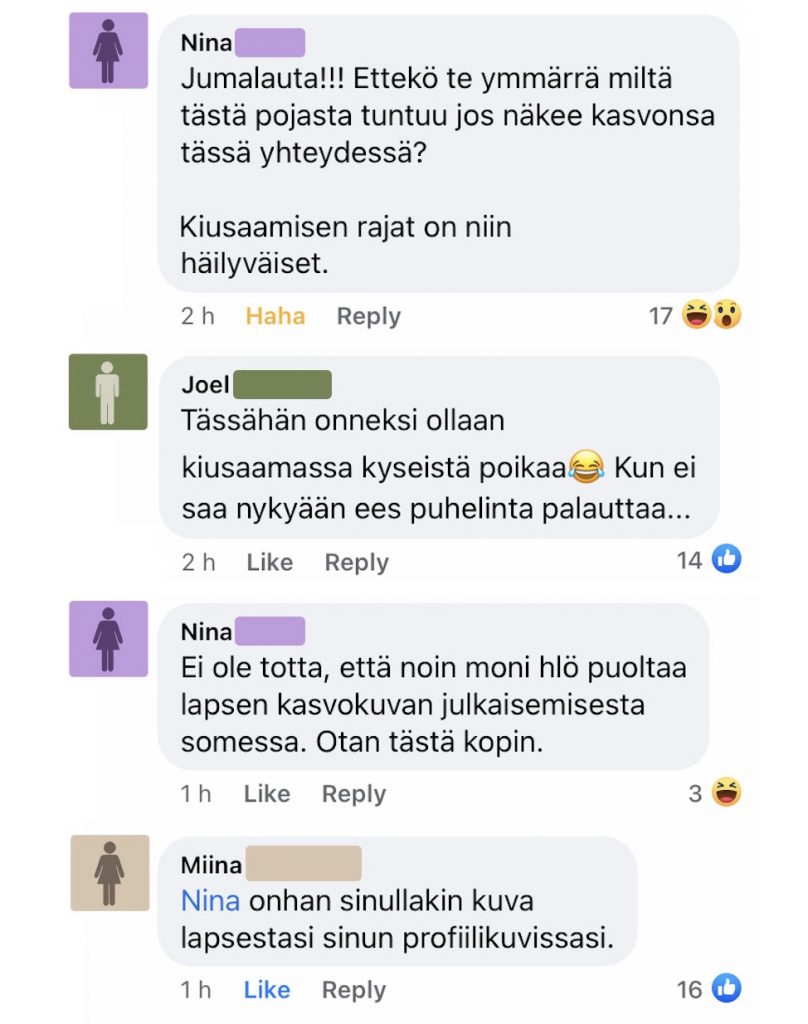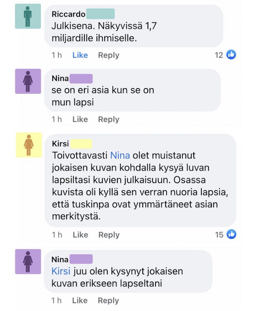 Timon ystävällinen teko johti kuitenkin välittömästi sanaharkkaan, kun Nina huomasi julkaisun. Suomalaisnaisen mukaan Timon kannatti poistaa julkaisu välittömästi, koska siinä näkyy lapsen kasvot. Nina totesi ettei lapsen kuvaa voi esitellä ryhmässä johon kuuluu 17 000 ihmistä – tässä ei kuitenkaan esitelty lasta vaan puhelinta, jonka alkuperäinen omistaja varmasti kaipasi sitä. Samalla muut huomauttivat, että myös Ninalla on kuvia lapsistaan, joiden ottamiseen ei luultavasti ole kysytty lupaa.