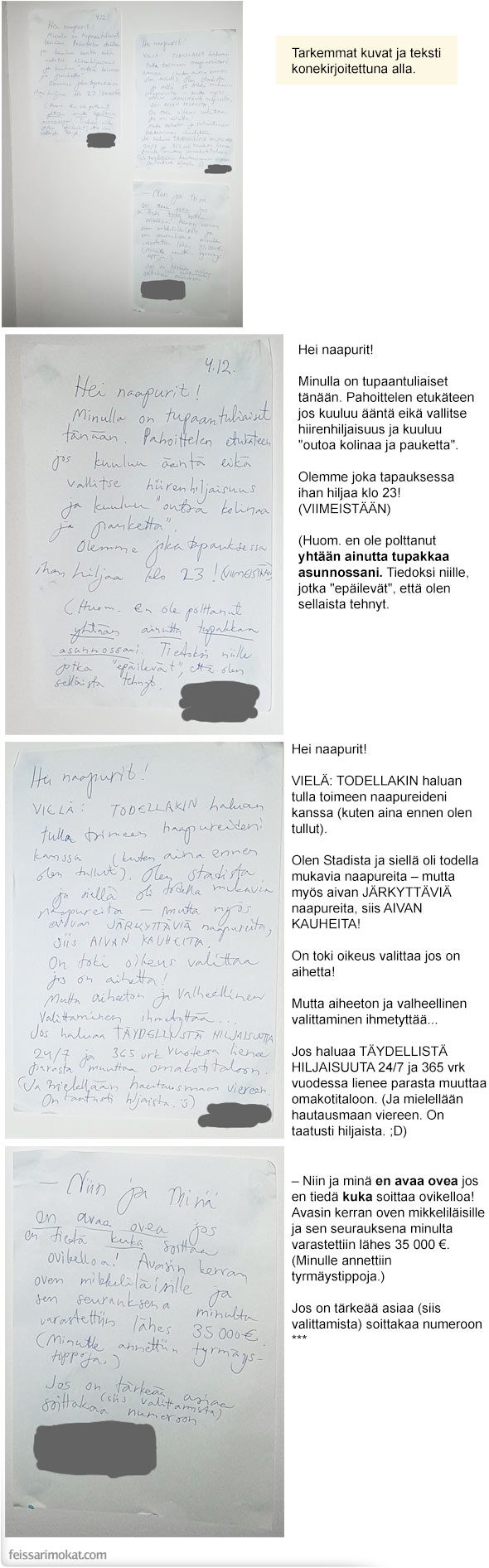 Feissarimokat: Naapuri laittoi rappukäytävään kolme viestiä, jotka saivat muut hieraisemaan silmiä