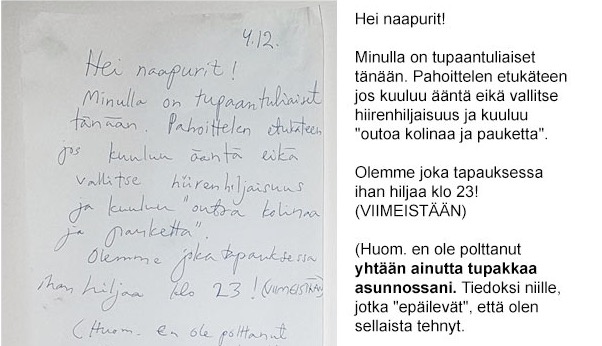 Kerrostaloon muuttanut asukas oli päättänyt varoittaa naapureita tupareiden vuoksi syntyvästä äänestä.