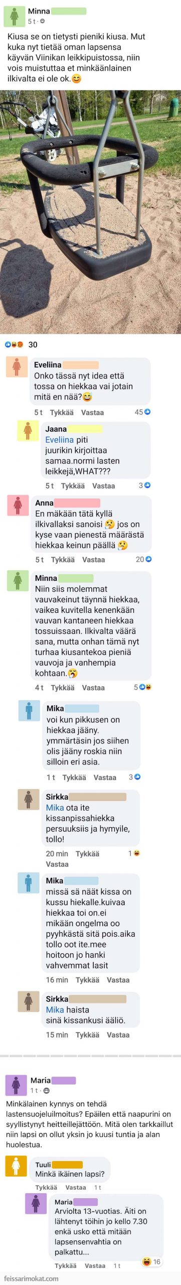 Eräs nainen oli todella pahoillaan, kun lastenkeinuihin oli laitettu hiekkaa. Jos asiaa miettii järkevästi niin some-päivityksen tekemisen sijasta keinua olisi voinut kallistaa ja suurin osa hiekoista olisi pudonnut maahan.
