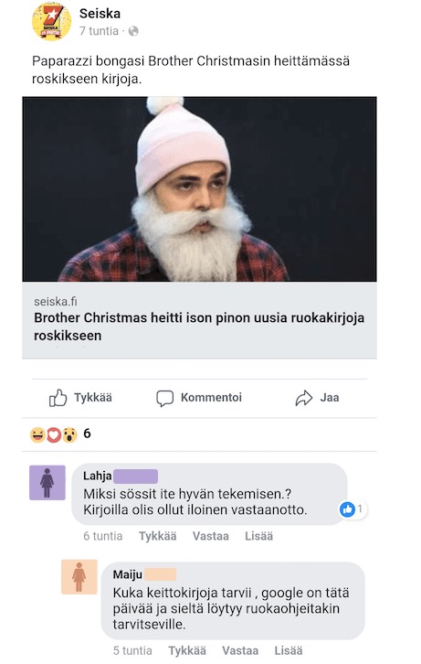 Kirjoja roskiin heittänyt julkkisa herätti paheksuntaa sosiaalisessa mediassa. Osa ihmisistä oli kuitenkin sitä mieltä, että keittokirjat ovat turhia, kun apuna voi käyttää nettiä ja sen tarjoamia palveluita.Kaikki eivät pidä Googlesta tai internetistä