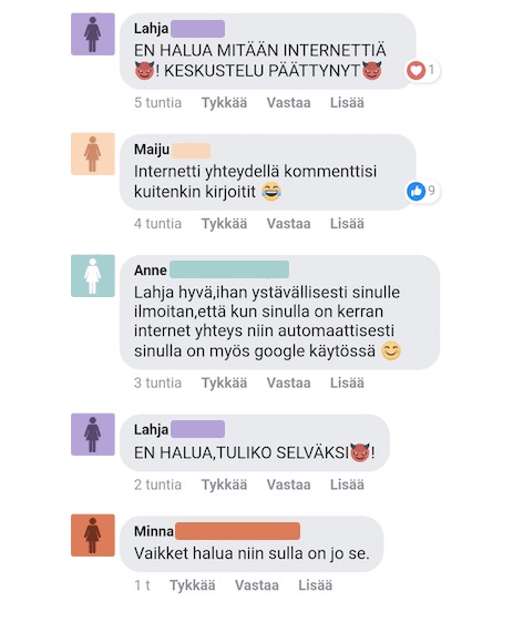 Lahja niminen nainen ei halunnut käyttää Googlea tai Internetiä, mutta hän ei taida tietää sitä että Facebookin, Iltalehden ja Ilta-Sanomien sivut toimivat myös netin avulla. Niinpä oheinen keskustelu on pitkälti väittelyä siitä, kuinka nettiä voisi halutessaan käyttää myös reseptien ja muiden asioiden selvittämiseen. Toivottavasti Lahjalla olisi jokin läheinen tai tuttava, joka voisi avustaa näiden hommien kanssa.