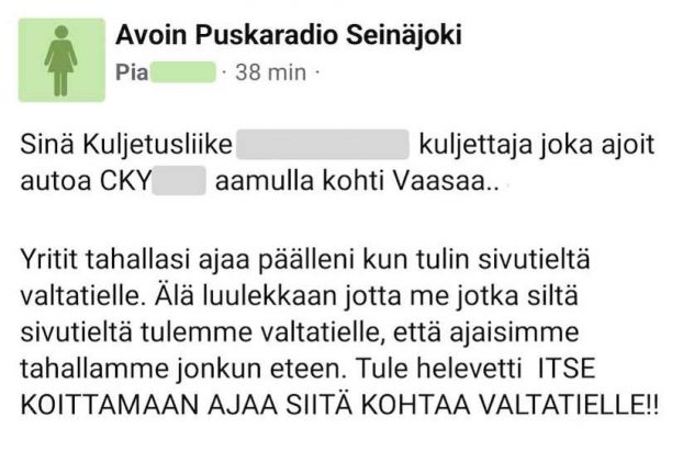 Eräs suomalaisnainen raivostui, kun hän liittyi valtatielle ja joutui painamaan kaasun pohjaan. En oikein osaa sanoa mitä kuorma-autoa kuljettaneen henkilön olisi pitänyt tehdä toisin. Lisäksi moottoritielle liittyessä on väistämisvelvollisuus.
