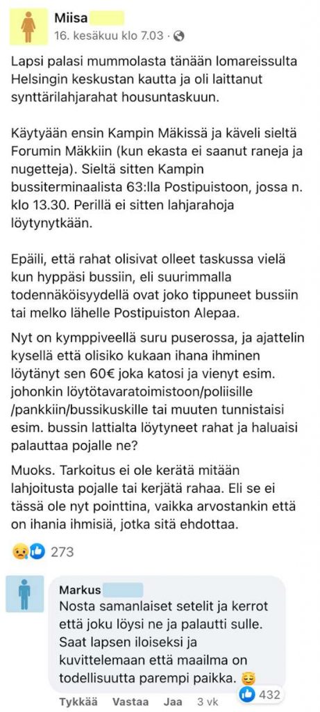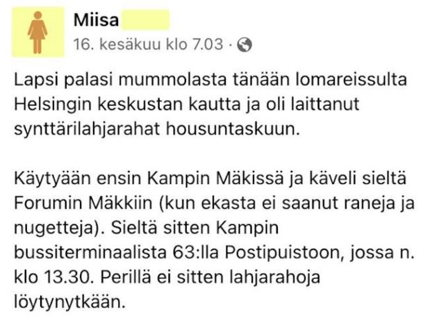 Miisa valitteli Facebookissa ikävää tilannetta, jossa hänen lapsensa oli mummolasta palattuaan hukannut 60 euroa.