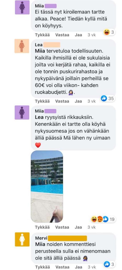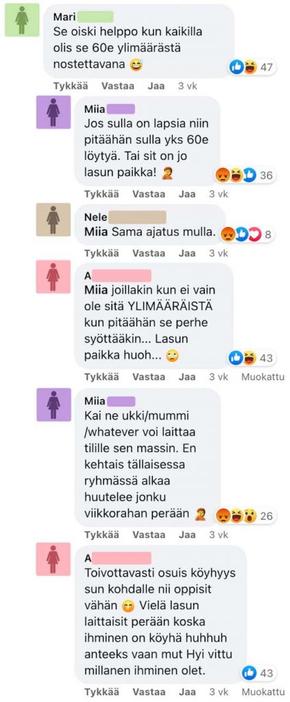 Miian mielestä pitäisi tehdä lastensuojeluilmoitus, jos vanhemmalla ei ole antaa lapselle 60 euroa ylimääräistä. On surullista, että osa ihmisistä kuvittelee rahan ja hyvän vanhemmuuden kulkevan käsi kädessä.