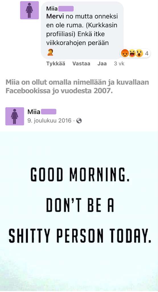 Juttua lukiessa käy nopeasti ilmi, että Miialla on aika negatiivinen asenne monia asioita ja ihmisiä kohtaan. Ei voi muuta kuin sanoa, että onnea valitsemallesi tielle.
