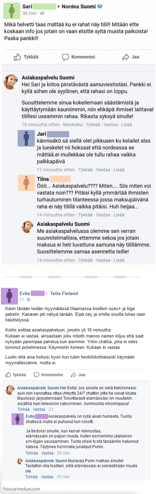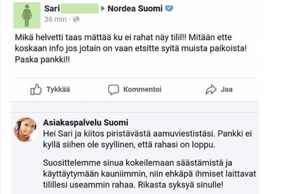 Sari oli vihainen, sillä hänen rahansa eivät näkyneet pankkitilillä. Niinpä hän päätti avautua ongelmasta ja saikin nopeasti vastauksen ”Asiakaspalvelu Suomi” -nimiseltä käyttäjätililtä. Voit lukea alta parhaita paloja, joihin Asiakaspalvelu Suomi on vastannut parhaan osaamisensa mukaan. Joudut luultavasti pidättelemään naurua.
