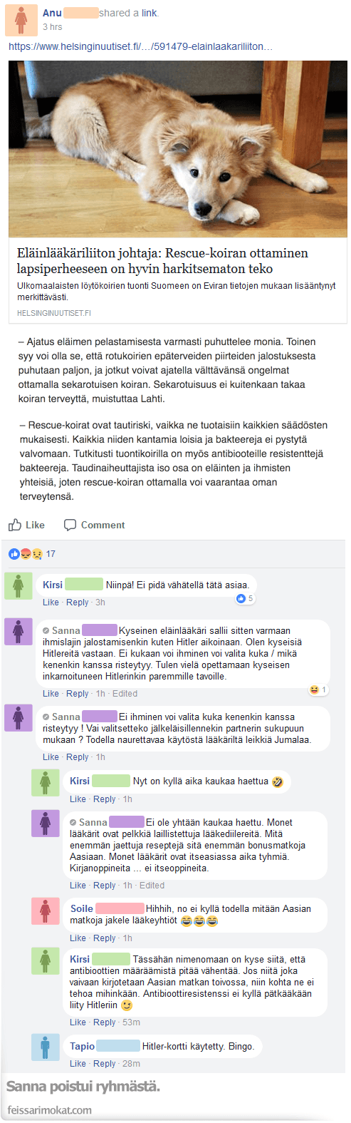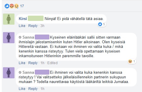 Poimimme erään keskustelun, jossa eläinlääkäriä alettiin vertaamaan Hitleriin. Eläinten oikeuksia tulee puolustaa, mutta joskus kannattaa miettiä onko pelissä enemmän tunnetta kuin järkeä. Raivoissaan kirjoitetut tilapäivitykset eivät vie asioita eteenpäin ja ne aiheuttavat vain turhia väärinymmärrysten kautta johtuvia riitoja.