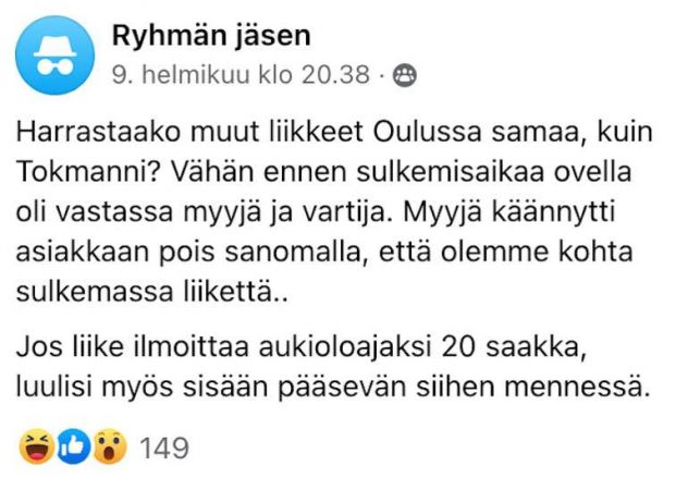 Feissarimokat: nainen toteaa – ”jos kauppa menee kiinni 20:00 niin asiakas pitää ottaa sisään vielä 19:59”