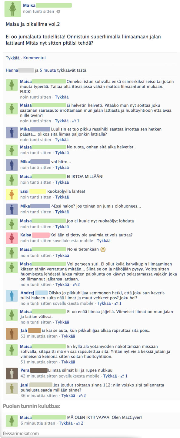 Pikaliimaa käyttäessä kannattaa olla tarkkana ettei liimaa pääty paljaalle iholle. Liima voi olla nimittäin erittäin herkästi ihoa ja limakalvoja ärsyttävää ainetta. Oli miten oli – tässä tapauksessa Maisa onnistui liimaamaan itsensä lattiaan kiinni.