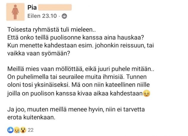 Feissarimokat: naisen mielestä hauskanpito ei kuulu avioliittoon – ”sitä ei voi mieheltä vaatia”