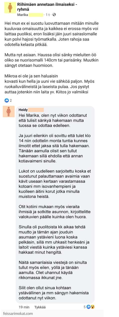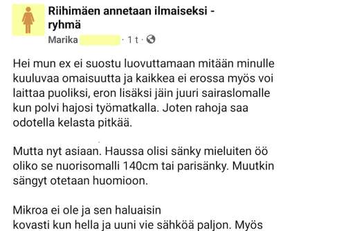 Eräs suomalaisnainen julkaisi surullisen tarinan, jossa hän kertoi erosta ja pitkästä sairaslomasta. Tämän johdattelemana hän ilmoitti tarvitsevansa sänkyä ja muita arjen kodinkoneita.