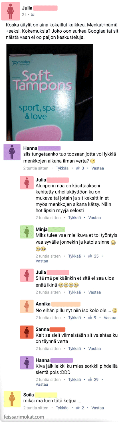 Feissarimokat: naiset kävivät tampooneihin liittyvän keskustelun – ei sovi herkille