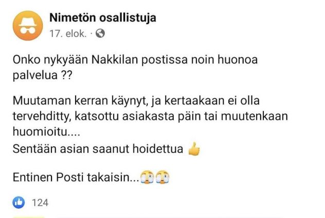 Nakkilan postissa vieraillut henkilö oli saanut poikkeuksellisen huonoa palvelua, kun häntä ei oltu edes tervehditty. Niinpä kyseinen henkilö vaati entistä Postia takaisin.