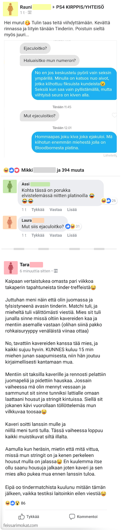 Tinder on kuin villi länsi, jossa seuraa etsivät aikuiset puhuvat suoraan ja rehellisesti. Siksi härskit kysymykset kuten esimerkiksi; ”mennäänkö panemaan” ja ”ejakuloitko”, eivät ole kovin harvinaisia.