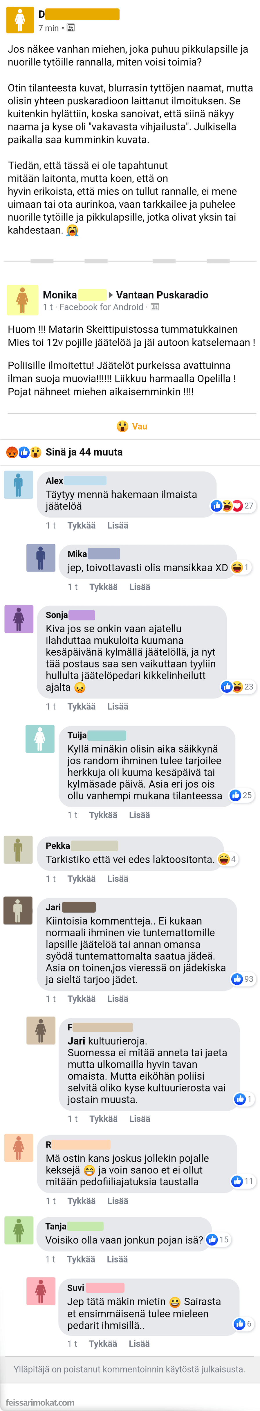 Täytyy kuitenkin sanoa, että oheisista julkaisuista varsinkin alempi oli todella epäilytttävä. Tuntemattomat miehet eivät nimittäin yleensä jakele jäätelöä tuntemattomille lapsille. Toisaalta voi myös olla, että ”namusetä” oli toisen tai molempien poikien isä. Olisin kuitenkin itse soittanut myös poliisit tai mennyt paikalle, jotta tilanne oltaisiin saatu varmistettua.