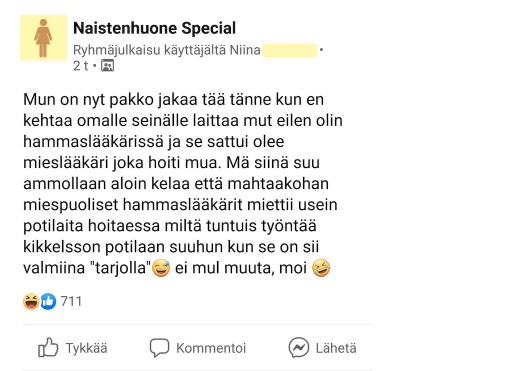 Eräs suomalaisnainen oli hammaslääkärin vastaanotolla alkanut pohtimaan härskejä juttuja. Miespuolinen hammaslääkäri oli hoitanut häntä ja samaan aikaan Niina oli miettinyt haluaisiko lääkäri pistää ”kikkelsonin” hänen suuhunsa toimenpiteen aikana.