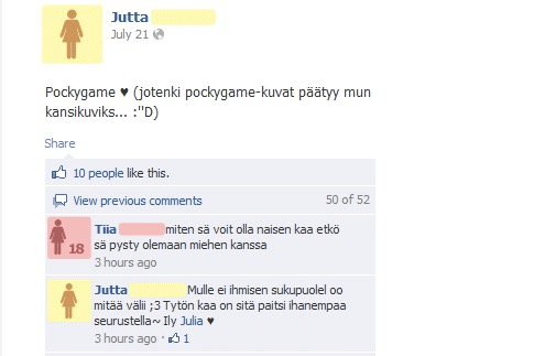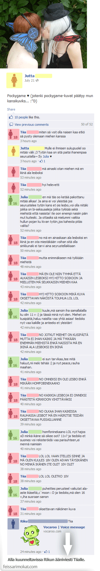 Jutta oli ladannut kuvan, jossa hän ilmeisesti suukottelee samaa sukupuolta olevan naisen kanssa. Samalla kuva provosoi erästä suomalaisnaista, joka alkoi huutelemaan kamalia herjauksia. Jokainen ihminen on lähtökohtaisesti oikeutettu seurustelemaan kenen kanssa tahansa. Voit lukea alta keskustelun, joka herättää suuren myötähäpeän tunteen.