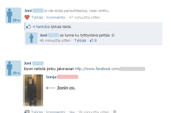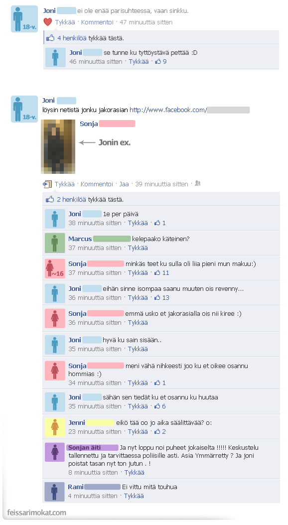 Nuorten erot eivät ole yhtä vakavia kuin aikuisten, mutta tämä ei tarkoita sitä etteivätkö ne voisi tapahtua myrskyisissä merkeissä. Joni ja Sonja olivat eronneet ja hetken kuluttua Joni päätti ”kostaa.” Hän sai kuitenkin nopeasti samalla mitalla takaisin… Tällaiset henkilökohtaisuudet voisi pitää omana tietonaan ja yrittää sopia Facebookin ulkopuolella. Toisten sukupuolielimistä ei siis tarvitse huudella koko kansan nähden. :D
