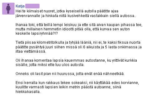 Eräs nainen pahoitti mielensä, kun nuoret tulivat rakastelemaan lähelle seuruetta, jossa oli mukana myös lapsia.