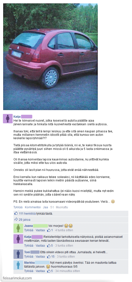 Feissarimokat: nuoret harrastivat lemmenleikkejä autossa – kukkahattutäti repi pelihousunsa
