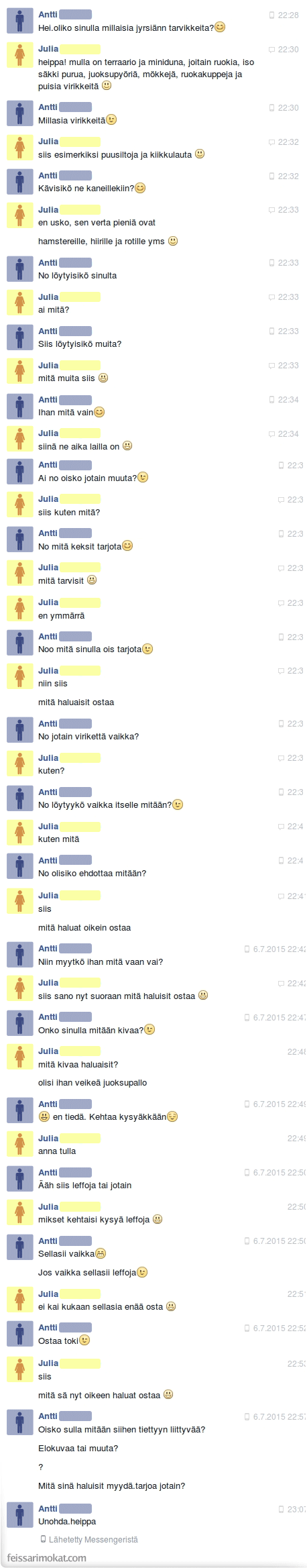 Antti otti Juliaan yhteyttä ja kertoi tarvitsevansa hamsteri- ja kanilelujen lisäksi ”jotain sellaista kivaa”. Pitkän arvuuttelun jälkeen kävi ilmi, että kyse oli ”sellaisista leffoista”. Valitettavasti Antti ei saanut itselleen sitä mitä halusi. Voit lukea keskustelun alta.