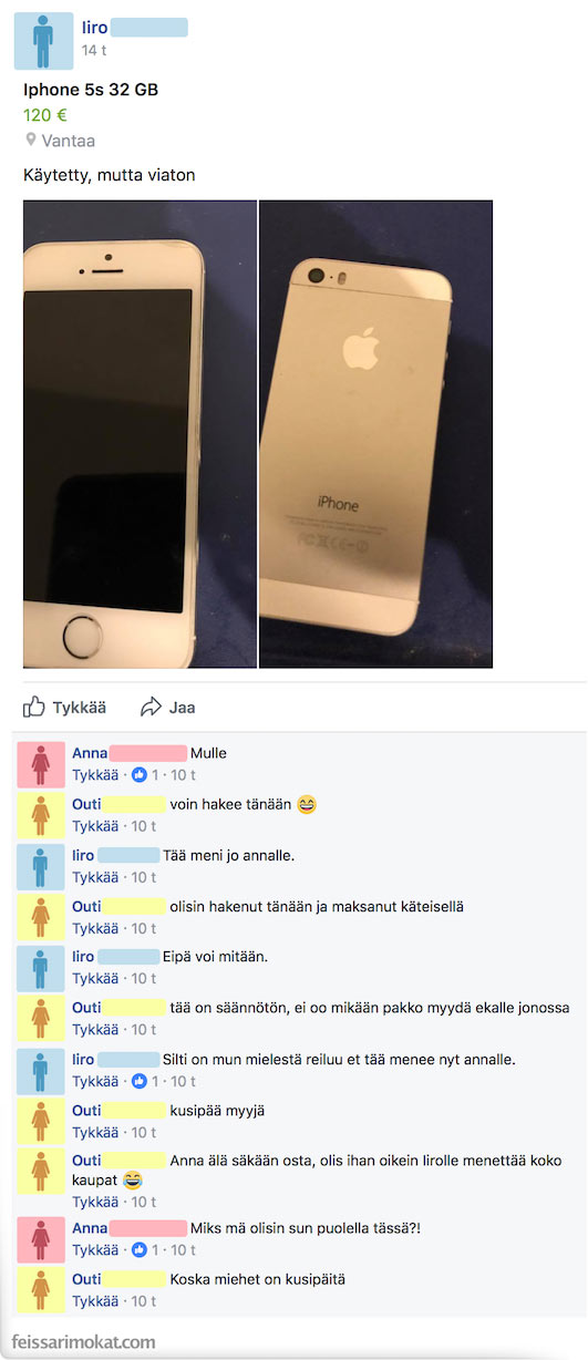 Iiro oli päättänyt laittaa Iphone 5s 32 Gb -puhelimensa myyntiin 120 euron hinnalla. Ei mennytkään kuin muutama tunti, kun paikalla oli kaksi tuotteesta kiinnostunutta henkilöä.