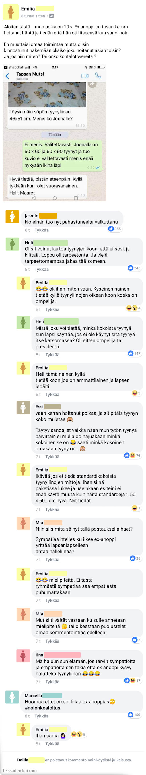 Esimerkiksi tässä tapauksessa hyväsydäminen anoppi halusi ostaa Emilian lapselle tyynyliinan – vastaukseksi hän sai suoran ja tylyn kommentin.