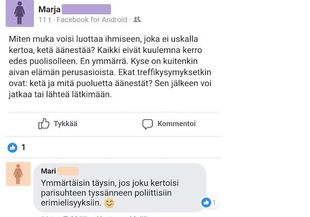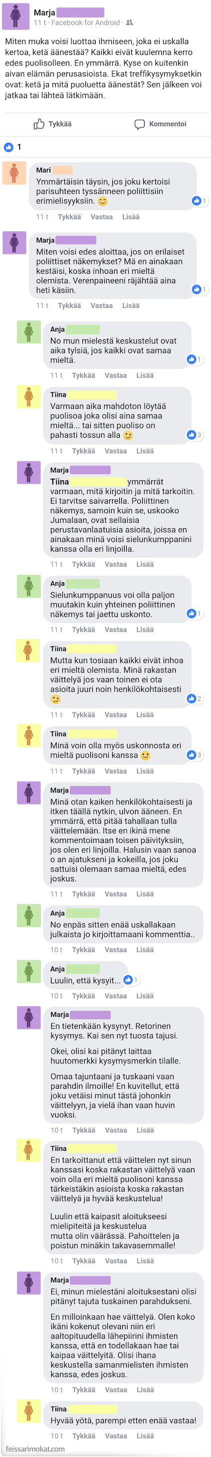 Jokaisella ihmisillä on oikeus omaan mielipiteeseen, eikä toisten näkökannoista kannata pahoittaa mieltään. Tämä tarina alkaa suomalaisnaisen tilapäivityksestä, jossa hän kummastelee vaalisalaisuutensa pitäviä ihmisiä. Parisuhteessa voidaan toki keskustella politiikasta, mutta oman kokemuksen mukaan keskustelu kehittyy nopeasti riidaksi. Marja oli sitä mieltä, että sielunkumppanuus vaatii yhteistä näkemystä politiikasta sekä uskonnosta.