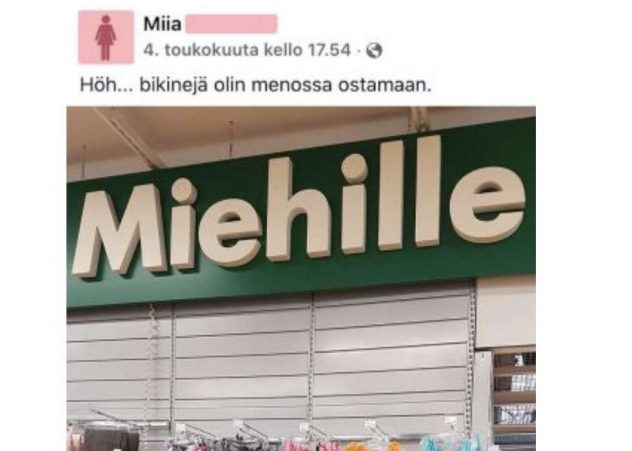Facebookissa ihmeteltiin Prisman uutta uima-asuosastoa, sillä miesten uimahousut olivat saaneet huomattavasti enemmän väriä ja söpöjä röyhelöitä. No kyllä jokainen tietää, että tässä oli mennyt naisten ja miestenosasto sekaisin, mutta kyllähän asia silti herätti hilpeitä reaktioita.