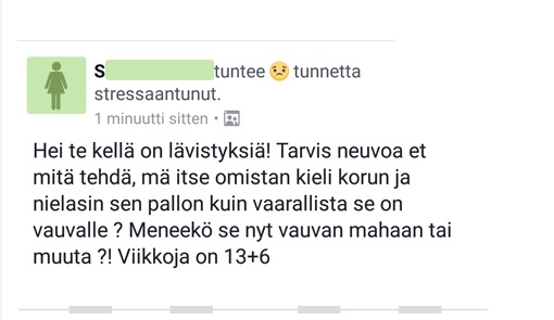 Feissarimokat: Raskaana oleva nainen nielaisi kielikorun – kysyy apua tilanteeseen