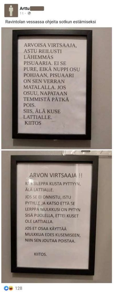 Feissarimokat: ravintolan selkeät pisuaariohjeet miehille – ”Ei se nuppi osu pohjaan”