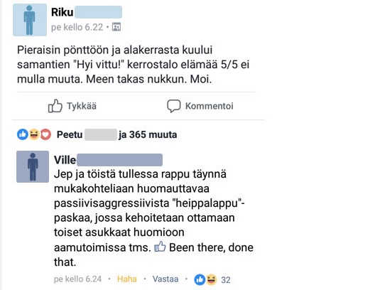 Erityisesti vanhemmissa kerrostaloissa kaikenlaiset äänet tuppaavat kuulumaan todella hyvin. Naapurin vessassa käynti, makuuhuoneessa peuhaaminen ja riitely ovat arkipäiväisiä ääniä.